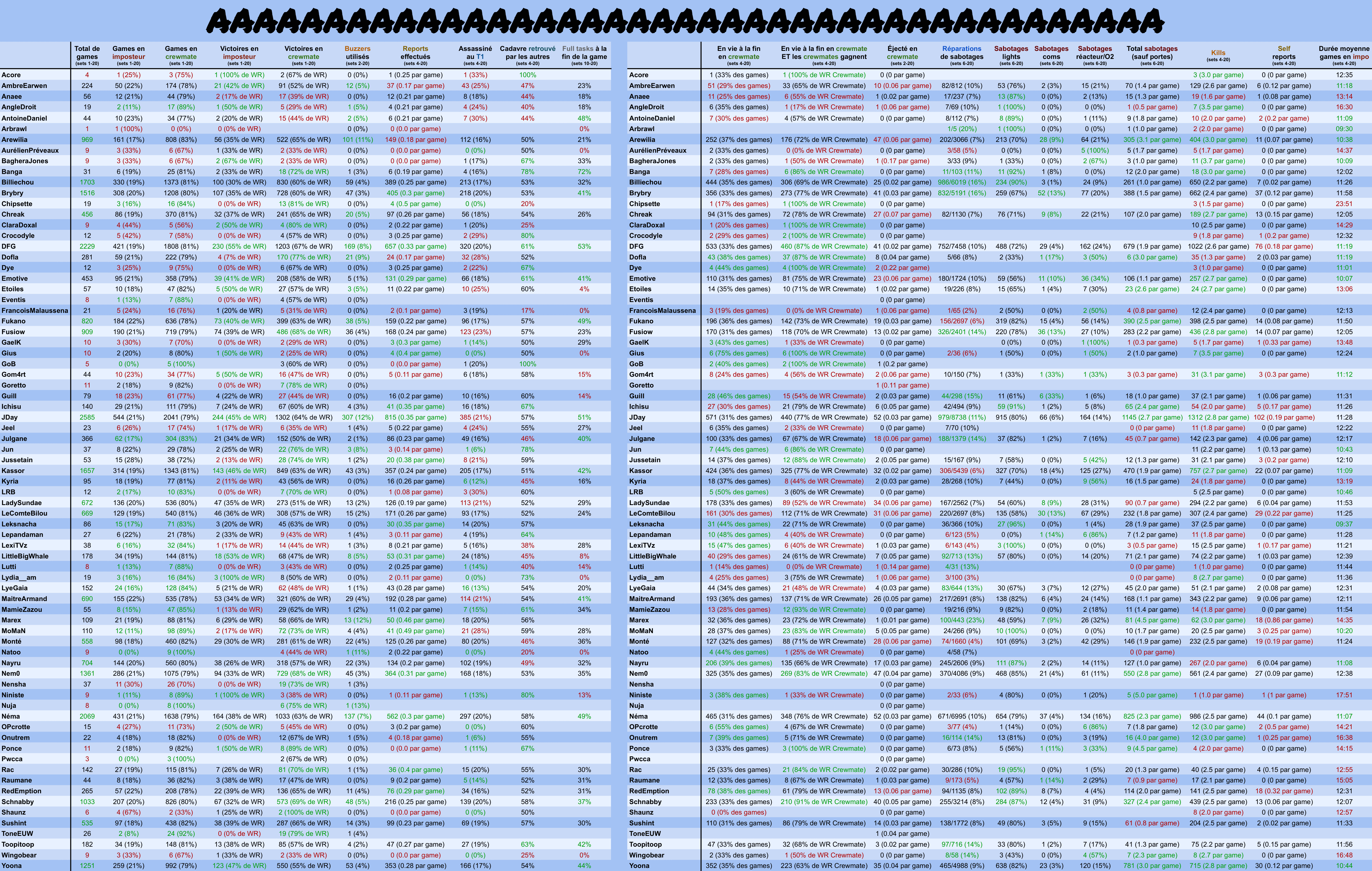 Un énorme tableau un peu horrible à lire mais qui contient toutes les stats de tous les Dingus jusqu'à présent.